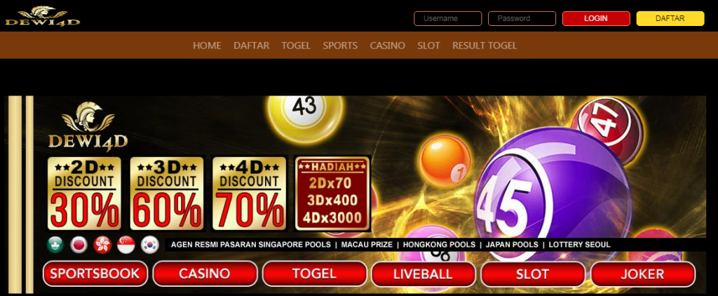 Bandar Judi Togel Singapore SGP | Dewi4d-Merupakan website judi bandar Togel Online terpercaya di Indonesia yang memiliki berbagai macam permainan judi online seperti Casino Online, Slot Games, Live Ball dan masih banyak permainan judi online seru lainnya yang bisa anda mainkan dengan cukup mendaftarkan dan melakukan deposit untuk mendapatkan kredit di 1 akun ID anda saja sudah dapat bermain di berbagai permainan judi online di Dewi4d.